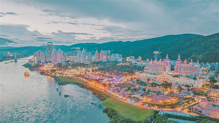 2025年8月28日,雲南省西雙版納傣族自治州景洪市,告莊西雙景星光夜市與周邊高樓相映成景,「夜經濟」繁榮火爆。呂華當攝/光明圖片