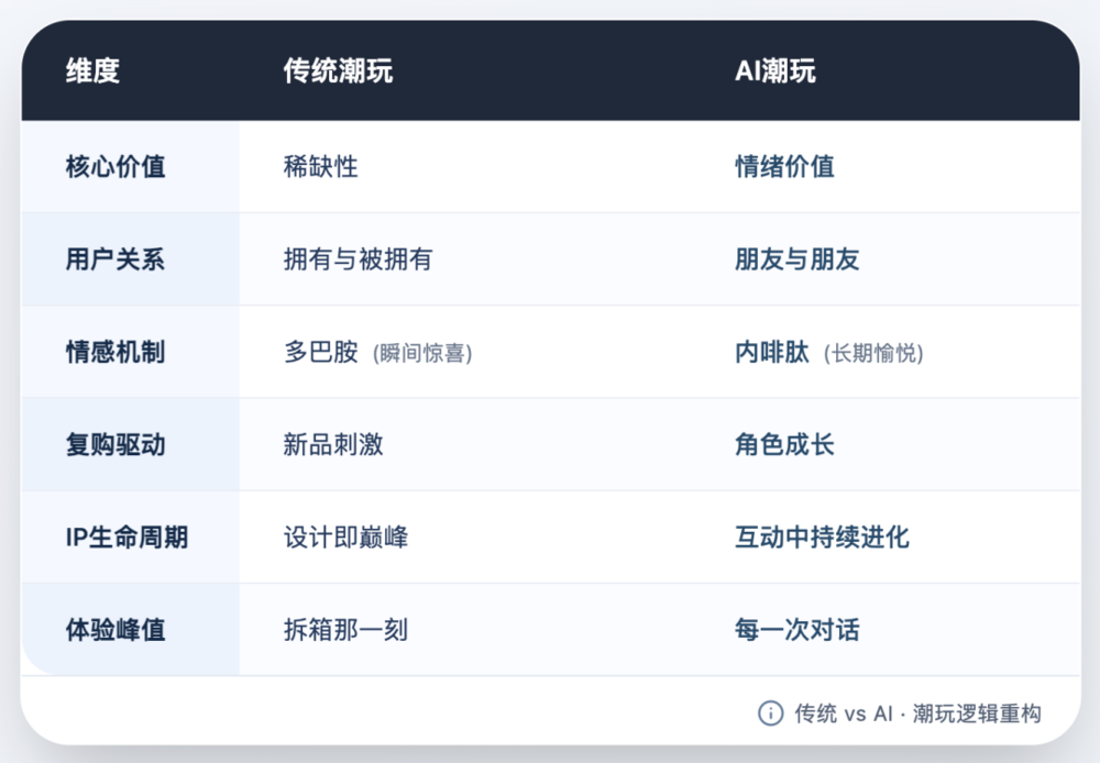 傳統潮玩賣的是瞬間的確定性驚喜,AI潮玩賣的是長期的不確定性陪伴。這是兩種完全不同的商業邏輯。