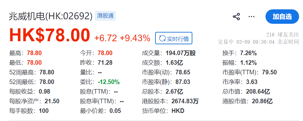 樂居財經 王敏3月9日,兆威機電(HK:02692)在港交所掛牌上市,招商證券、德意志證券聯席保薦,其開盤漲9.43%,總市值208.6億港元。
