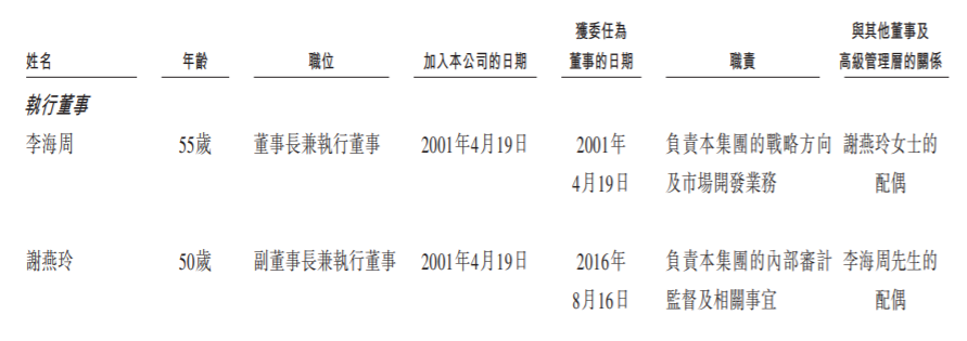 李海周擔任公司董事長兼執行董事,謝燕玲擔任副董事長兼執行董事。