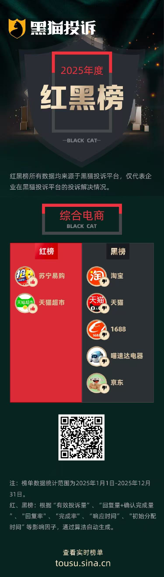 截至2025年底,黑貓投訴平台累計收到有效投訴近3195萬件,近2475萬件消費糾紛得到企業回覆。年度企業紅黑排行榜根據2025年全年企業在黑貓平台的投訴處理數據,公正客觀、開放透明地反映商家對待消費糾紛的服務態度及服務質量。一方面希望全行業以優質服務企業為標杆,為消費者提供更好的消費體驗和更優質的售後服務;另一方面也是對不負責任企業的監督與曝光,為消費者提供選購參考。