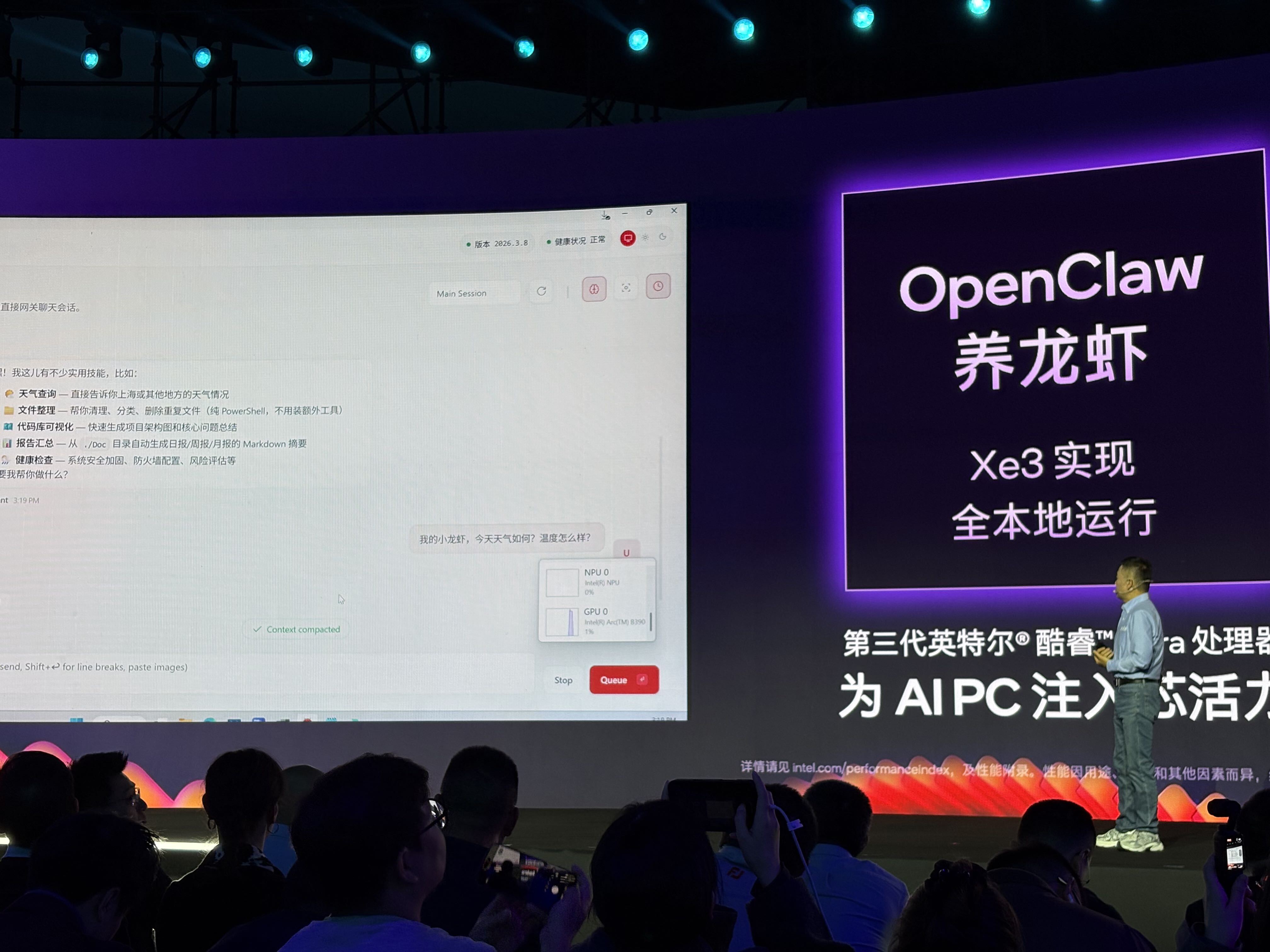 最受關注的還是部署在本地的「小龍蝦演示」——英特爾在現場演示了一台配備32GB顯存並搭載酷睿Ultra X的筆記本,在部署OpenClaw後,可本地調用35B模型,來執行多樣化的任務。