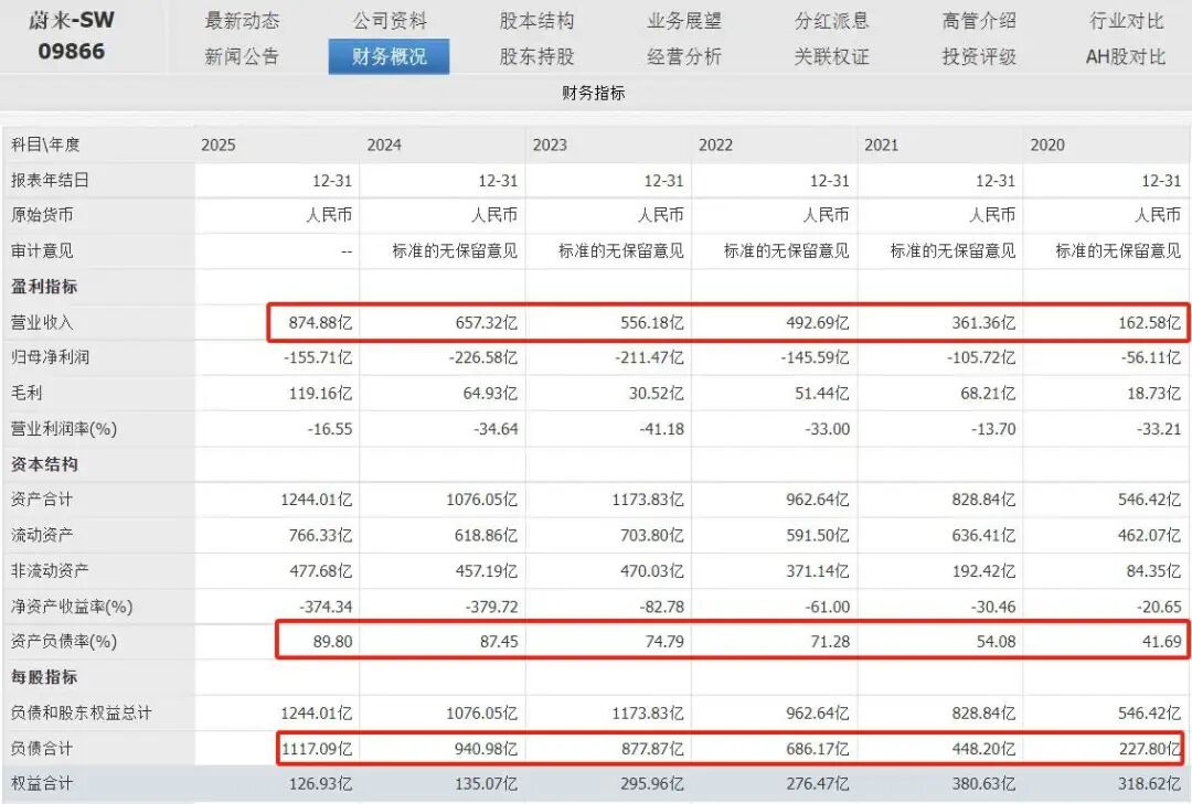2020年至2025年——蔚來營收從162.58億元增長至874.88億元;但負債總額從227.8億元飆升至1117.09億元;資產負債率從41.69%一路攀升至89.8%,距離90%近在咫尺;同期,股東權益從318.62億元縮水至126.93億