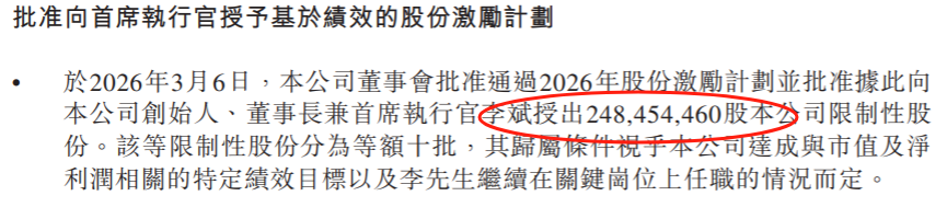 2025年3月19日,小鵬汽車宣佈向何小鵬授予2850.68萬股公司股份,解鎖條件與股價直接掛鉤:連續30個交易日股價達到250港元,授予三分之一;連續30個交易日股價達到500港元,授予三分之一;連續30個交易日股價達到750港元,授予剩餘三分之一,有效期為十年。按照當時小鵬汽車89.55港元/股的股價計算,何小鵬想要拿到全部股權激勵,股價需大漲7.4倍,若達成目標,這筆股權激勵價值高達142.5億。