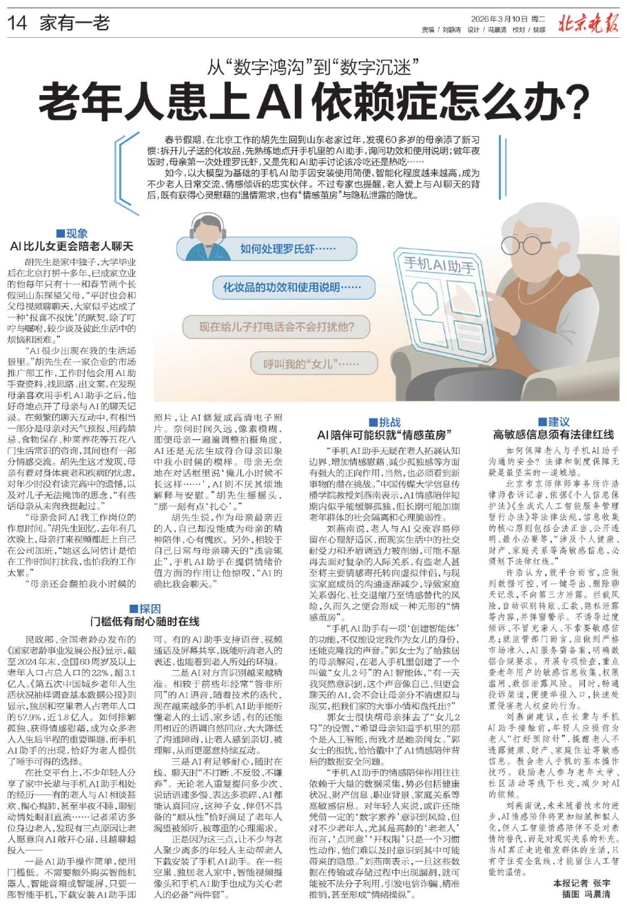 「手機AI助手的情感陪伴作用往往依賴於大量的數據採集,勢必包括健康狀況、財產信息、職業背景、家庭關係等高敏感信息。對年輕人來說,或許還能憑藉一定的‘數字素養’意識到風險,但對不少老年人,尤其是高齡的‘老老人’而言,‘點同意’‘開權限’只是一個習慣性動作,他們難以及時意識到其中可能帶來的隱患。」劉燕南表示,一旦這些數據在傳輸或存儲過程中出現漏洞,就可能被不法分子利用,引發電信詐騙、精準推銷,甚至形成「情緒操縱」。