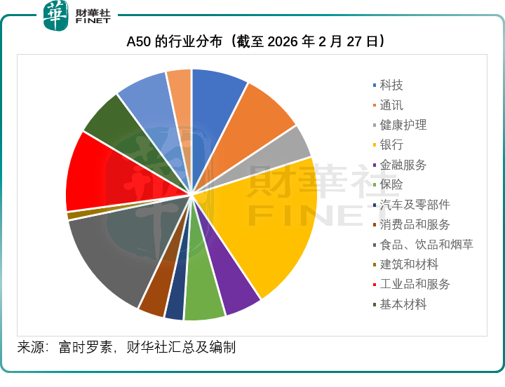 從富時羅素提供的數據來看,截至2026年2月27日,中國A50的前五大成分股分別為貴州茅台(600519.SH)(9.45%)、寧德時代(300750.SZ)(7.78%)、紫金礦業(601899.SH)(4.21%)、招商銀行(600036.SH)(4.13%)和中國平安(601318.SH)(3.51%),合計權重 29.07%。