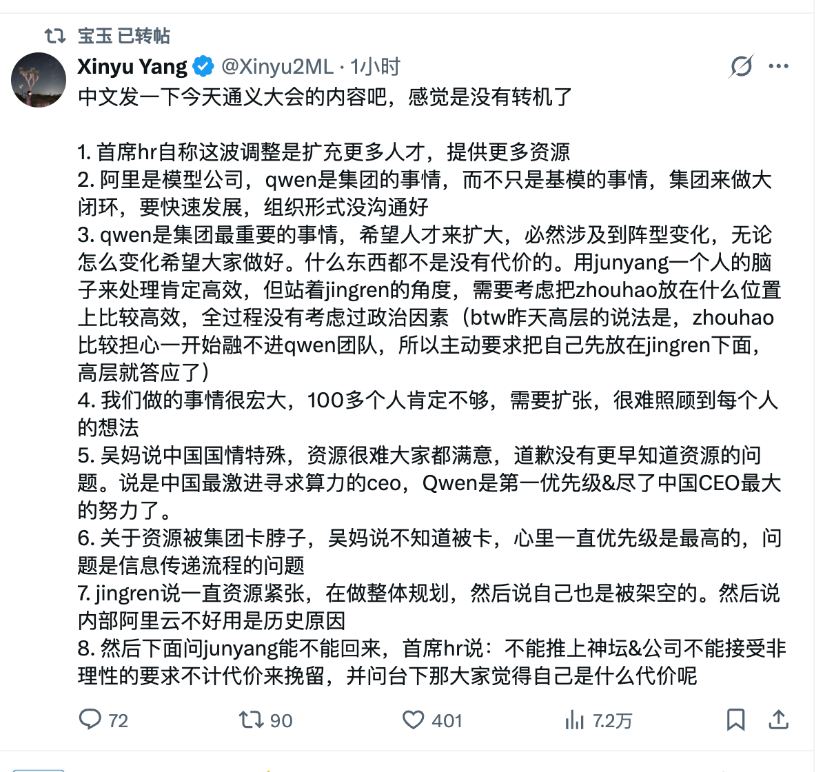 3月4日下午,有博主在X上披露了阿里千問內部大會最新的要點。根據該博主的整理,在會上,阿里方面表示,這一輪調整的初衷是為了擴大團隊規模、投入更多資源,並將Qwen從「基礎模型團隊」升級為整個集團級別的核心項目,未來將以更大規模的人才和資源投入推動模型能力的發展。管理層同時強調,隨着團隊擴張,組織結構發生變化幾乎不可避免。阿里巴巴CEO吳泳銘還表示,對與Qwen資源被集團卡脖子一事並不知情。