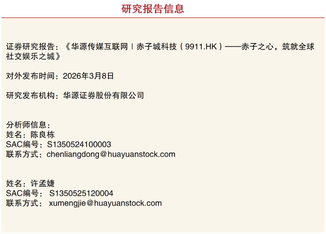 Ø盈利預測與評級:公司收入及利潤在產品能力穩固基礎上近年來穩步提升,我們認為公司後發產品仍處在快速增長期,後續伴隨產品進入成熟期後利潤率或有較大優化空間。預計2025/2026/2027年將實現歸母淨利潤9.37/12.17/15.39億元,當前股價(2026/03/06)對應估值12x/9x/7x,可比公司騰訊控股、Grindr、雅樂科技2025-2027年平均估值為18X/15X/16X,首次覆蓋,給予「買入」評級。