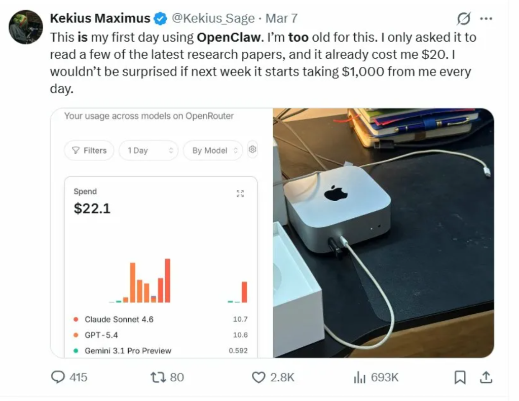 X用戶@Kekius Sage 發文圖槽 : 「這是我用OpenClaw的第一天,我真的老了。」他只是讓龍蝦讀了幾篇最新研究論文,一天賬單就跑到了22.1美元。他在帖子裏感嘆,如果這樣下去,下周沒準每天要被它划走1000美元。