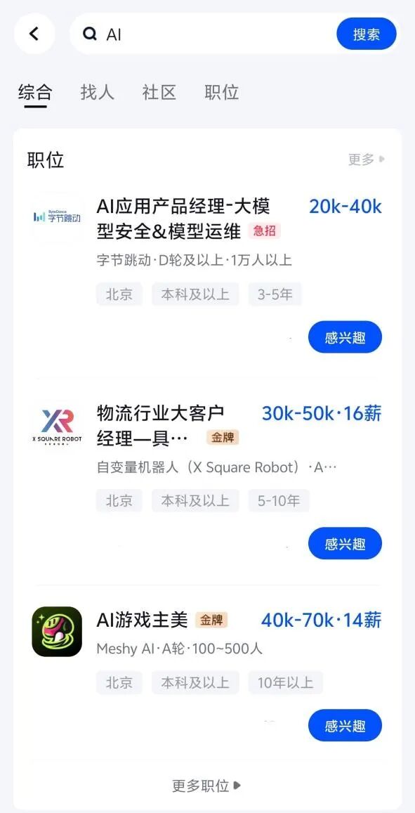 ↑記者在脈脈上搜索「AI」後出現的崗位