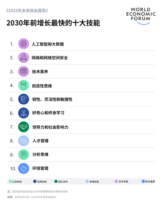 如今,掌握AI技能已成為勞動力市場的「入場券」。世界經濟論壇(WEF)2025年發布的《未來就業報告》指出,到2030年,將有22%的就業機會面臨變革,新創造的工作崗位數量為1.7億個,而被替代的工作崗位數量為9200萬個,就業機會淨增7800萬個。