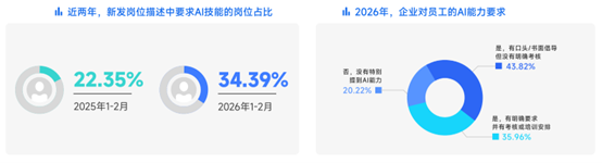 在求職市場上,AI能力已成為求職者的重要門檻。報告指出,34.39%的新發崗位描述中帶有「AI」、「大模型」等關鍵詞,這一比例較2025年同期(22.35%)大幅提升。