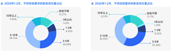 2026年1-2月的新發崗位中,3年以上經驗要求的崗位佔比已達73.34%,其中3-5年經驗的崗位量按年增幅達到19%,成為新發崗位的核心年資段。