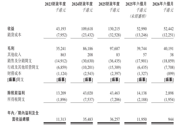 然而,一個值得警惕的財務信號是:營收的高速增長並未轉化為同等比例的利潤增長,甚至出現了嚴重的背離。在2023至2025三個完整財年內,公司的年內溢利分別為1131.3萬港元、3548.3萬港元及3625.7萬港元。表面上看,利潤絕對值在增長,但若計算淨利潤率,則分別為26.2%、32.2%和27.8%,2025財年已出現下滑趨勢。