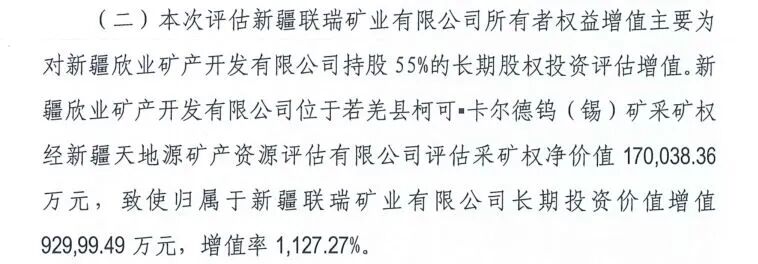 《新疆若羌縣柯可·卡爾德鎢(錫)礦採礦權價值評估報告》文件披露,新疆聯瑞礦業公司持股55%的新疆欣業礦產開發公司名下擁有「新疆若羌縣柯可·卡爾德鎢(錫)礦採礦權,這一個採礦權的評估值為17億元,評估基準日為2025年4月30日。