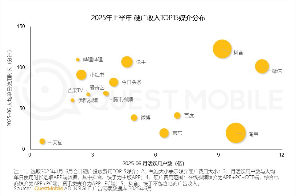 廣告商正在尋求具有更高「投入產出比」的廣告投放策略。QuestMobile數據顯示,2025年上半年硬廣投放TOP15平台中,愛奇藝已跌出前十,顯示出其在廣告主心中的優先級正在下降。