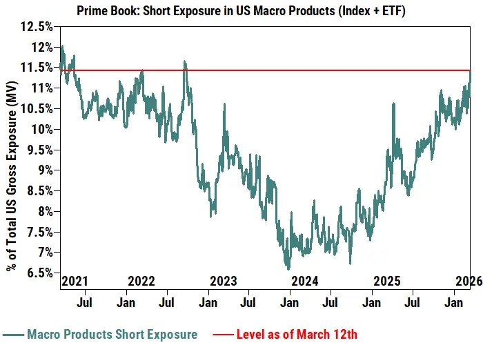 從更宏觀的視角來看,以宏觀產品(指數與ETF合併計算)空頭敞口占Prime賬簿美國總市值的比例衡量,當前水平已升至2022年9月以來最高,處於五年曆史數據的第97百分位,逼近五年高點。
