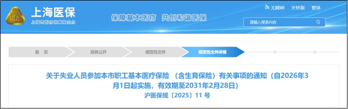 上海市醫保局發布《關於失業人員參加本市職工基本醫療保險(含生育保險)有關事項的通知》。通知自2026年3月1日起實施,有效期至2031年2月28日。