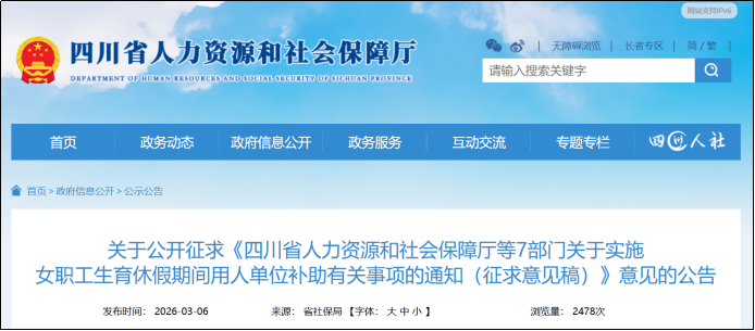 3月6日,四川省人力資源和社會保障廳公布《四川省人力資源和社會保障廳等7部門關於實施女職工生育休假期間用人單位補助有關事項的通知(徵求意見稿)》,正式面向社會公開徵求意見,徵求意見期限為2026年3月7日至3月13日。