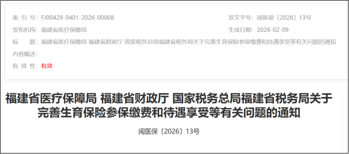 2月9日,福建省醫療保障局發布了《關於完善生育保險參保繳費和待遇享受等有關問題的通知》。通知自2026年3月1日起施行,有效期5年。