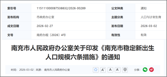 3月2日,南充市人民政府公布《南充市穩定新出生人口規模六條措施》(以下簡稱《六條措施》),適用於2026年1月1日至2028年12月31日期間結婚登記和生育的家庭,夫婦雙方或一方為南充戶籍且新生兒戶籍登記在南充,孩次按女方生育並存活子女數認定。