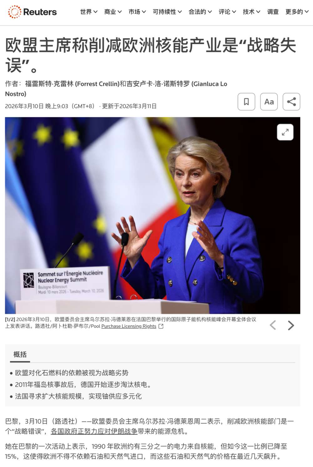 就在同一天、在同一個會上,歐盟委員會主席馮德萊恩表示,歐洲主動降低核能佔比,是一個「戰略性錯誤」。