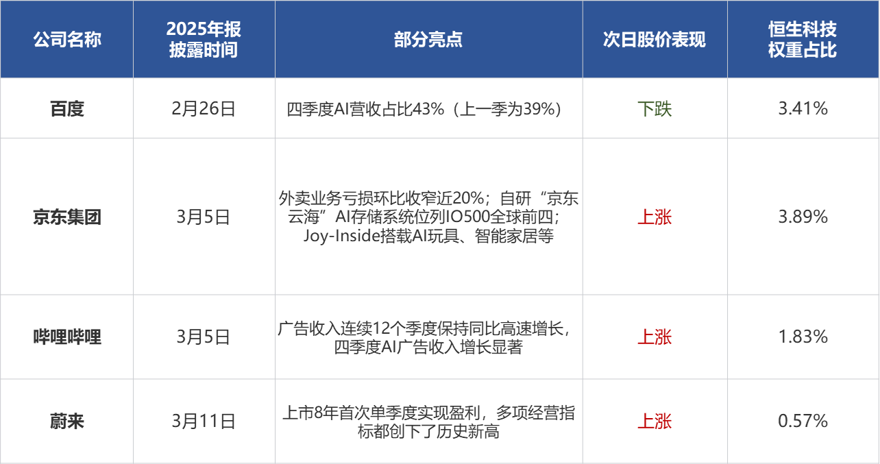 截至3月11日,百度集團-SWR(89888.HK)、京東集團-SW(09618.HK)、嗶哩嗶哩-W(09626.HK)、蔚來-SW(09866.HK)等港股科技巨頭已正式披露2025年財報,其中,嗶哩嗶哩、蔚來、百濟神州(06160.HK)等在全年/季度維度實現首次「扭虧為盈」,業績拐點明顯;互聯網企業在AI方面的進展也可圈可點。