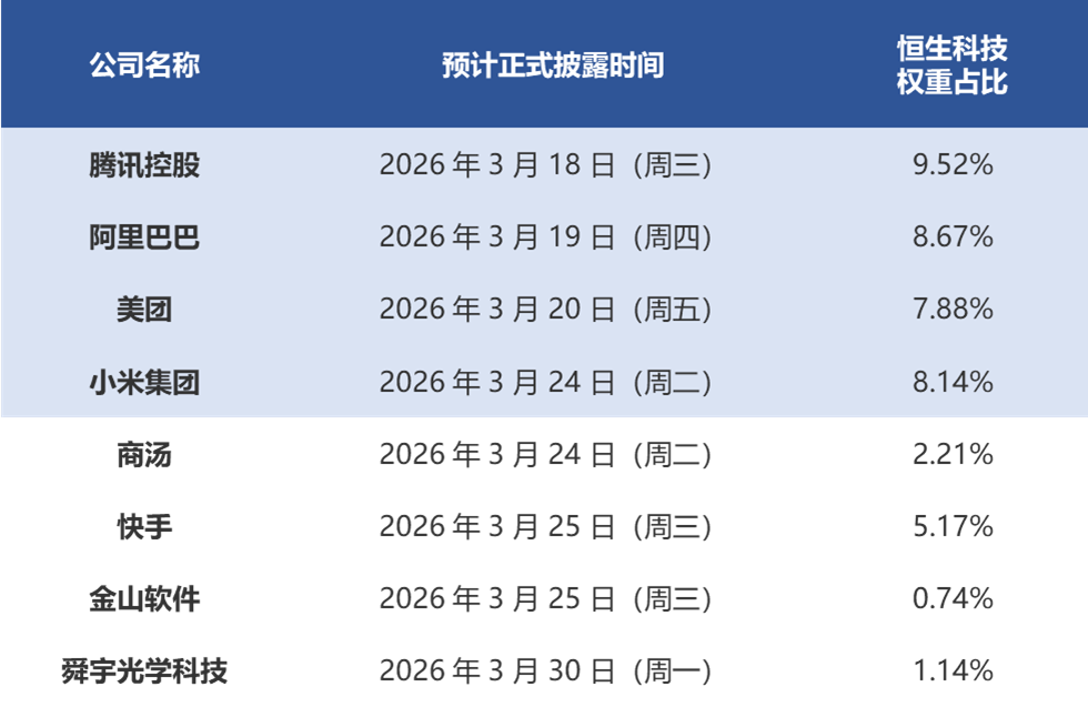 恒生科技、恒生互聯網權重股騰訊控股(00700.HK)、阿里巴巴-W(09988.HK)、美團、小米集團-W(01810.HK)的財報還未落地,將於3月中下旬密集披露。同樣的,外賣及電商業績表現、雲業務收入佔比、AI資本開支擴張等等,都將成為市場關注焦點,也將左右恒生科技、恒生互聯網等指數下一步走向。