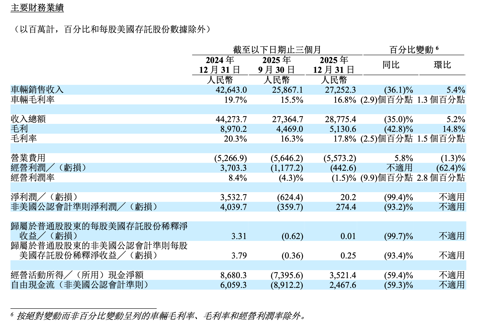 理想汽車 2025 年 Q4 主要財務指標|圖片來源:理想汽車財報