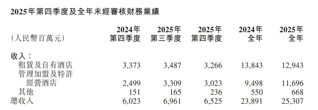 這背後,華住今年來自有酒店規模收縮,加盟模式成為業績增長的主要引擎。公告顯示,2025年全年華住來自租賃及自有酒店的收入為129億元,按年下降6.5%;來自管理加盟及特許經營酒店的收入為117億元,按年增長23.1%。