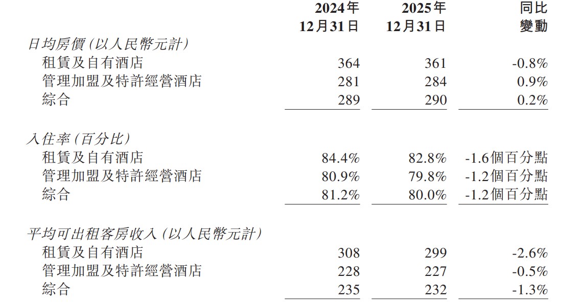 住宿行業核心運營指標方面,華住中國與華住國際同樣呈現分化。華住中國全年綜合日均房價(ADR)為290元,按年增長0.2%;入住率為80%,按年微降1.2個百分點;受入住率小幅下滑影響,全年平均可出租客房收入(RevPAR)為232元,按年減少1.3%。