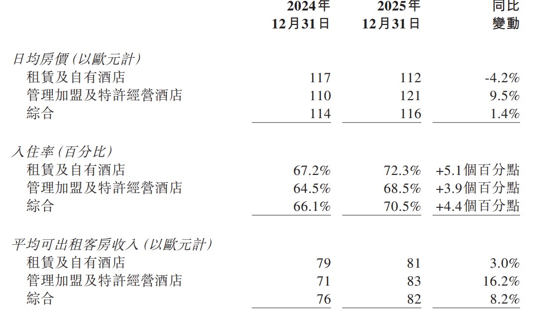 華住國際方面,全年ADR為116歐元,按年增長1.4%;入住率70.5%,按年增長4.4個百分點;RevPAR達82歐元,按年增長8.2%,海外市場運營能力穩步提升。