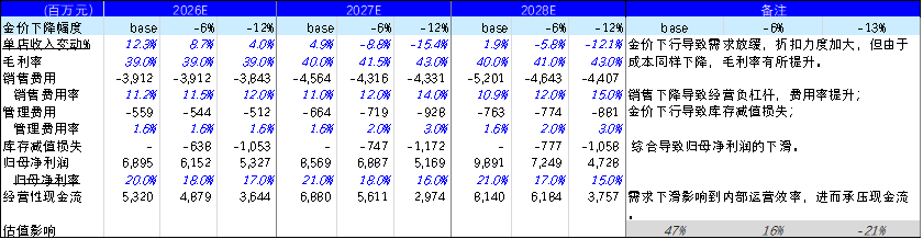 金價持續下跌時:若金價進入下跌周期,將削弱黃金的投資屬性,這將考驗老鋪品牌溢價並拖累收入。成本下行雖繼續支撐毛利率擴張,但是由於經營負槓桿以及庫存減值損失,將擠壓淨利潤。