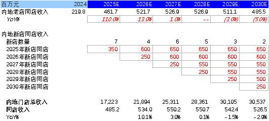 根據這些潛在開店商圈,我們預測到2030年,老鋪境內門店數將達到59家左右(契合公司管理層「內地+港澳50—60家」的長期目標),年均淨增2—6家,呈現平穩增長態勢。