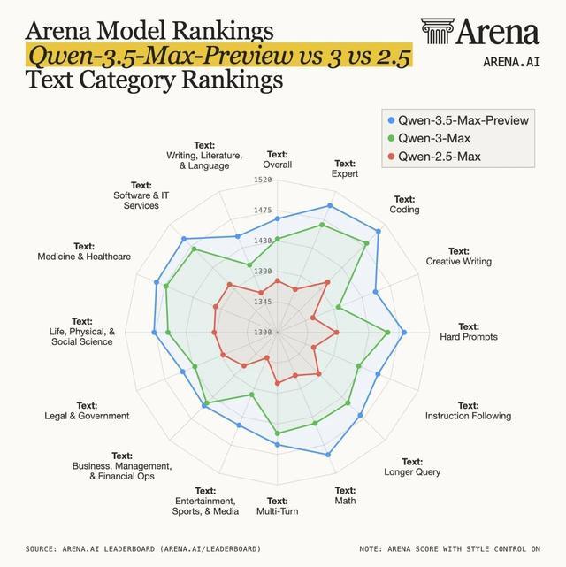 IT之家 3 月 20 日消息,阿里千問大模型家族再迎新成員。今日,Qwen3.5-Max-Preview 作為千問 3.5 系列的旗艦模型預覽版,在全球大模型競技平台 LM Arena 正式亮相,並獲得 1464 分的綜合得分。