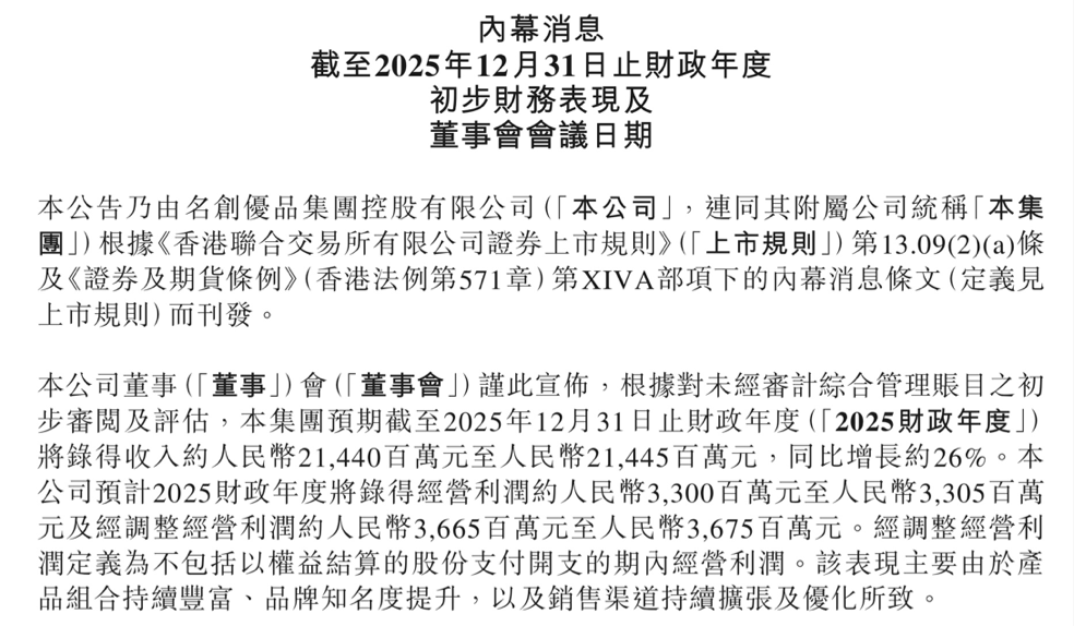 數據顯示,2025財年,公司將錄得收入約214.40億元至214.45億元,按年增長約26%;預計將錄得經營利潤約33億元至33.05億元及經調整經營利潤約36.65億元至36.75億元,均較上年同期有所增長。不過,名創優品預計將錄得年內利潤約13.20億元至13.30億元,與上年同期26.35億元相比,降幅約50%。