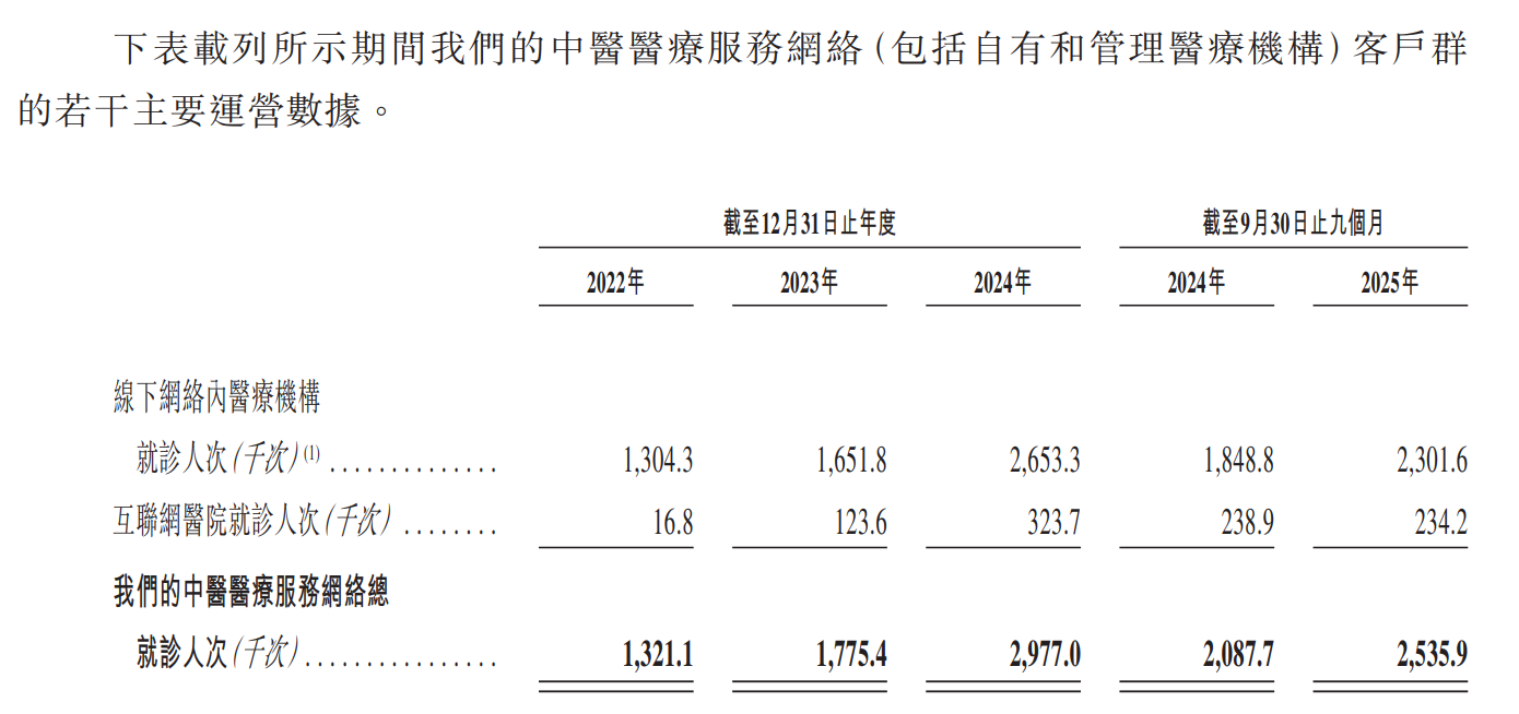 如果說品牌是同仁堂醫養的"面子",那麼醫師隊伍就是"裏子"——也是這家公司真正不可複製的核心資產。該公司的中醫醫療服務網絡客戶就診人次保持高增長水平,其中線下網絡醫療機構主要包括24家自有及管理的醫療機構,客戶就診人次保持雙位數的增長水平。2025年前三季度為230.16萬人次,按年增長24.5%;互聯網醫院就診人次於2022-2024年呈爆發式增長,2025年前三季度為23.42萬人次。客戶就診人次增長(24.5%)明顯高於收入增長,這一現象值得重點關注——它說明公司正處於"先圈客戶、後提價值"的戰略投入期,客戶基數的快速擴大為未來客單價提升和服務延伸奠定了堅實基礎。