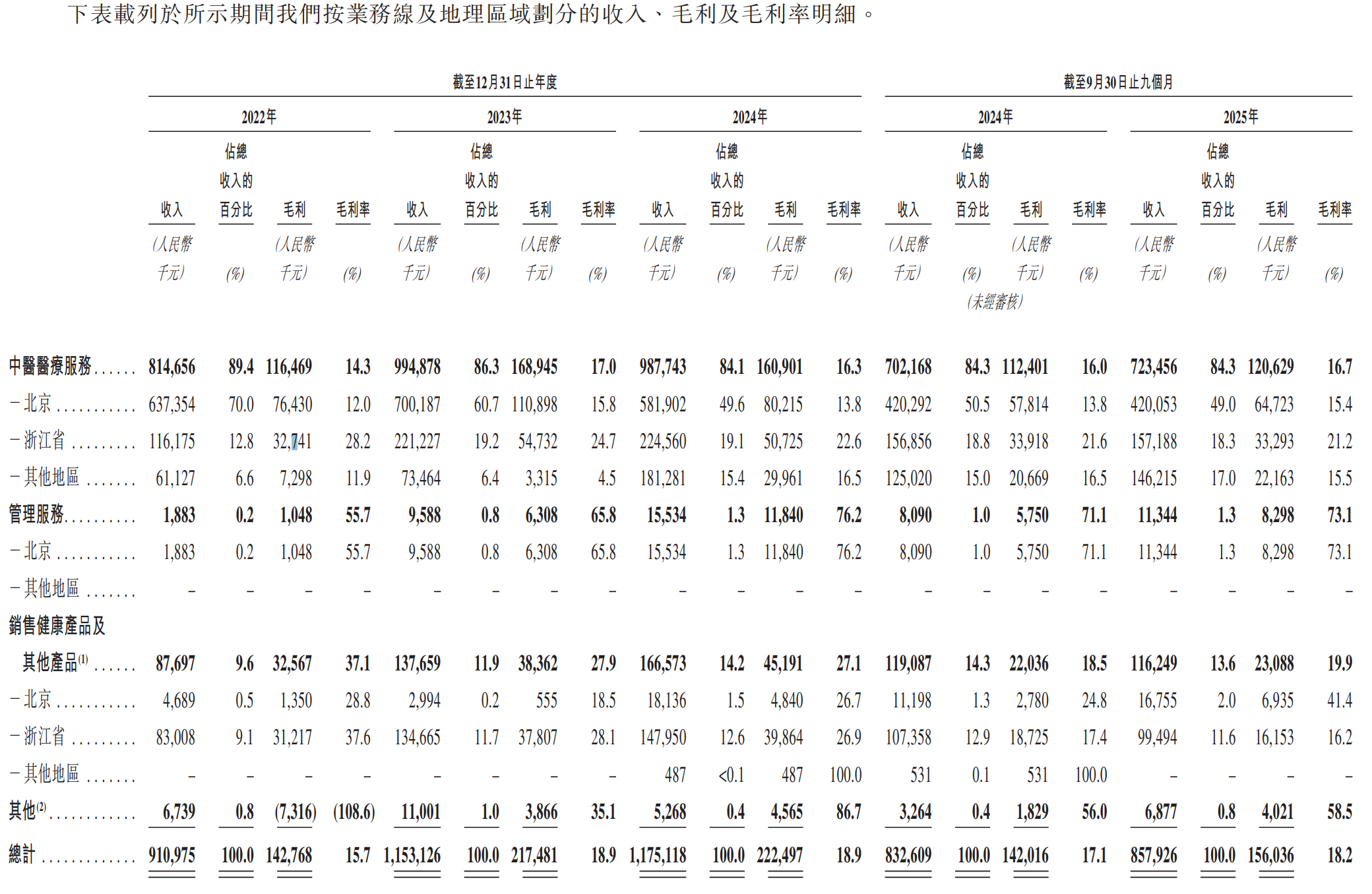 內生增長韌性十足:中醫醫療服務是該公司核心業績來源,在外部環境承壓下,其業務收入增長穩健,貢獻往年核心增長,特別是毛利潤佔比近八成。值得注意的事,該業務過往主要分佈在北京、浙江和上海三個地區,近期其他地區業務收入份額也呈現走高趨勢,從2022年的6.6%提升至2025年前三季度的17%,展現了該公司業務擴張的成效。