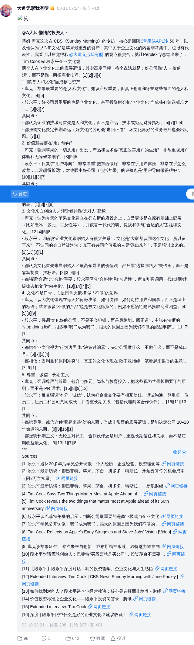 蒂姆·庫克這次在 CBS《Sunday Morning》的專訪,核心是回顧蘋果 50 年,以及他認為「人」和「文化」是蘋果最重要的資產,其中關於企業文化的內容非常集中、也很有代表性。我看了以後覺得和@大道無形我有型 的觀點很契合,就讓Perplexity總結出來了: