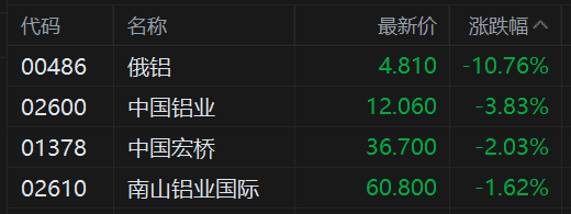3月18日,港股鋁業股持續走低,其中,俄鋁績後大跌近11%表現最差,中國鋁業跌近4%並且錄得4連跌,中國宏橋跌2%,南山鋁業國際跌1.6%。
