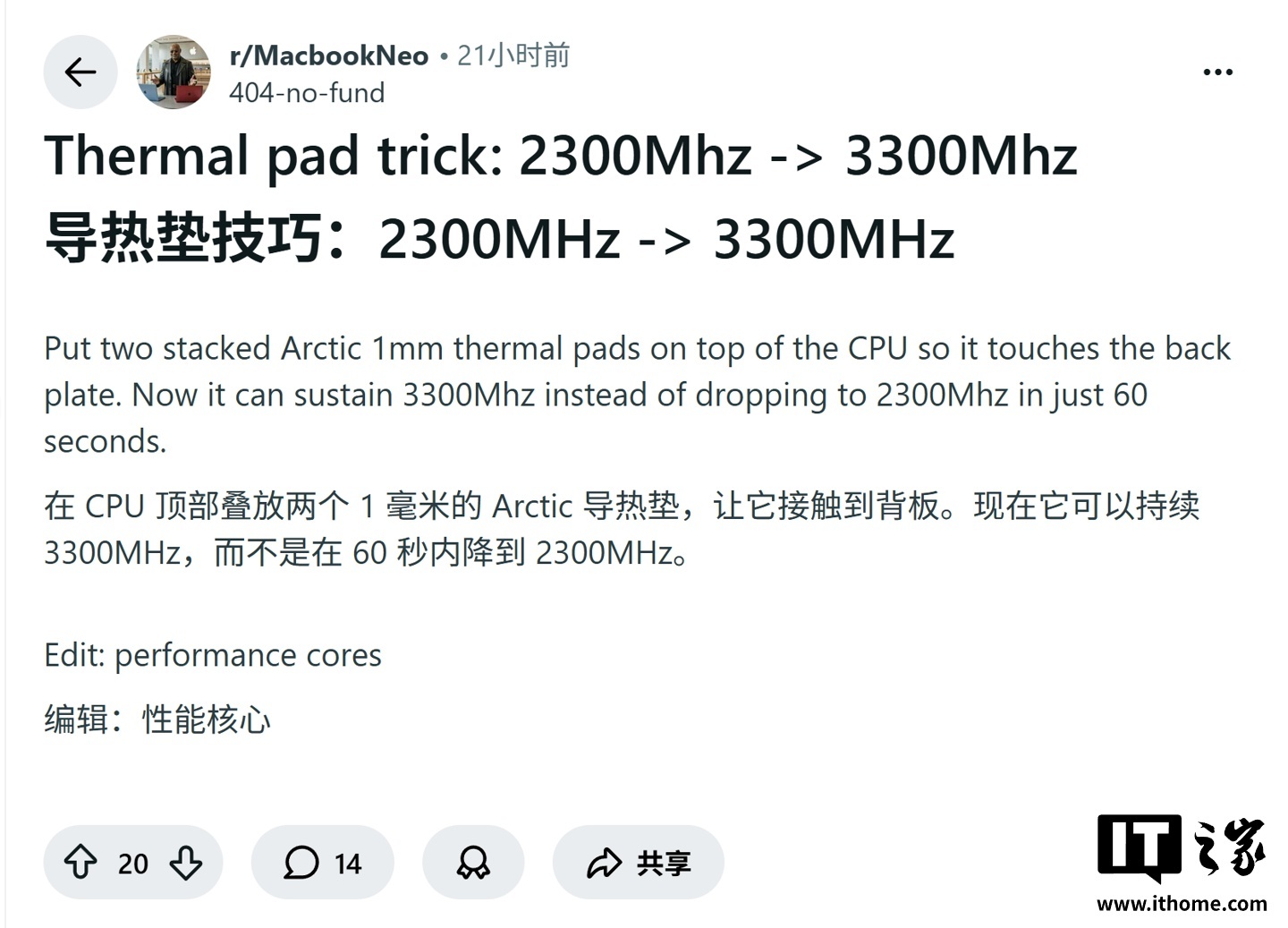 IT之家 3 月 17 日消息,科技媒體 Appleinsider 昨日(3 月 16 日)發布博文,報道稱有網友在 Reddit 社區發帖,分享了低成本改造蘋果 MacBook Neo 成果,將筆記本高負載下的持續主頻從 2.3GHz 躍升並穩定在 3.3GHz。