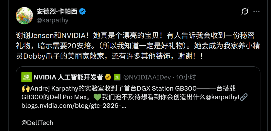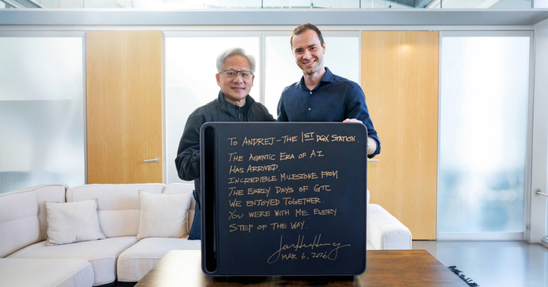 首台DGX Station(GB300)送給了卡帕西——這位AI時代的個人開發者代表。