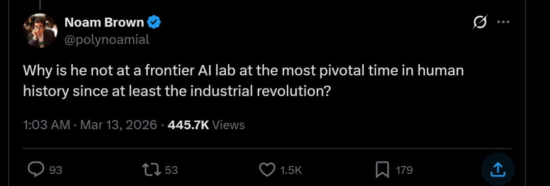 為什麼在人類歷史上——至少自工業革命以來最關鍵的時期,他(卡帕西)沒有出現在一個前沿的人工智能實驗室?