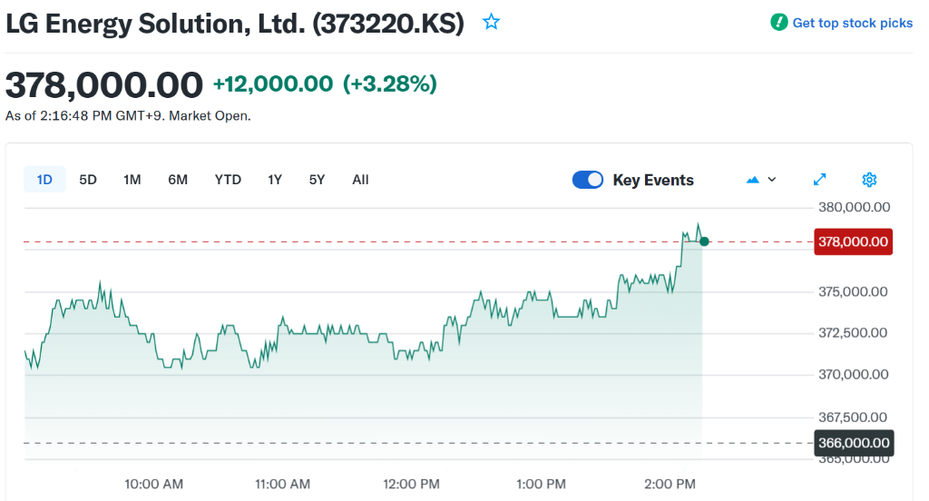 消息公布後,LG能源股價在首爾股市盤中一度上漲3.3%。