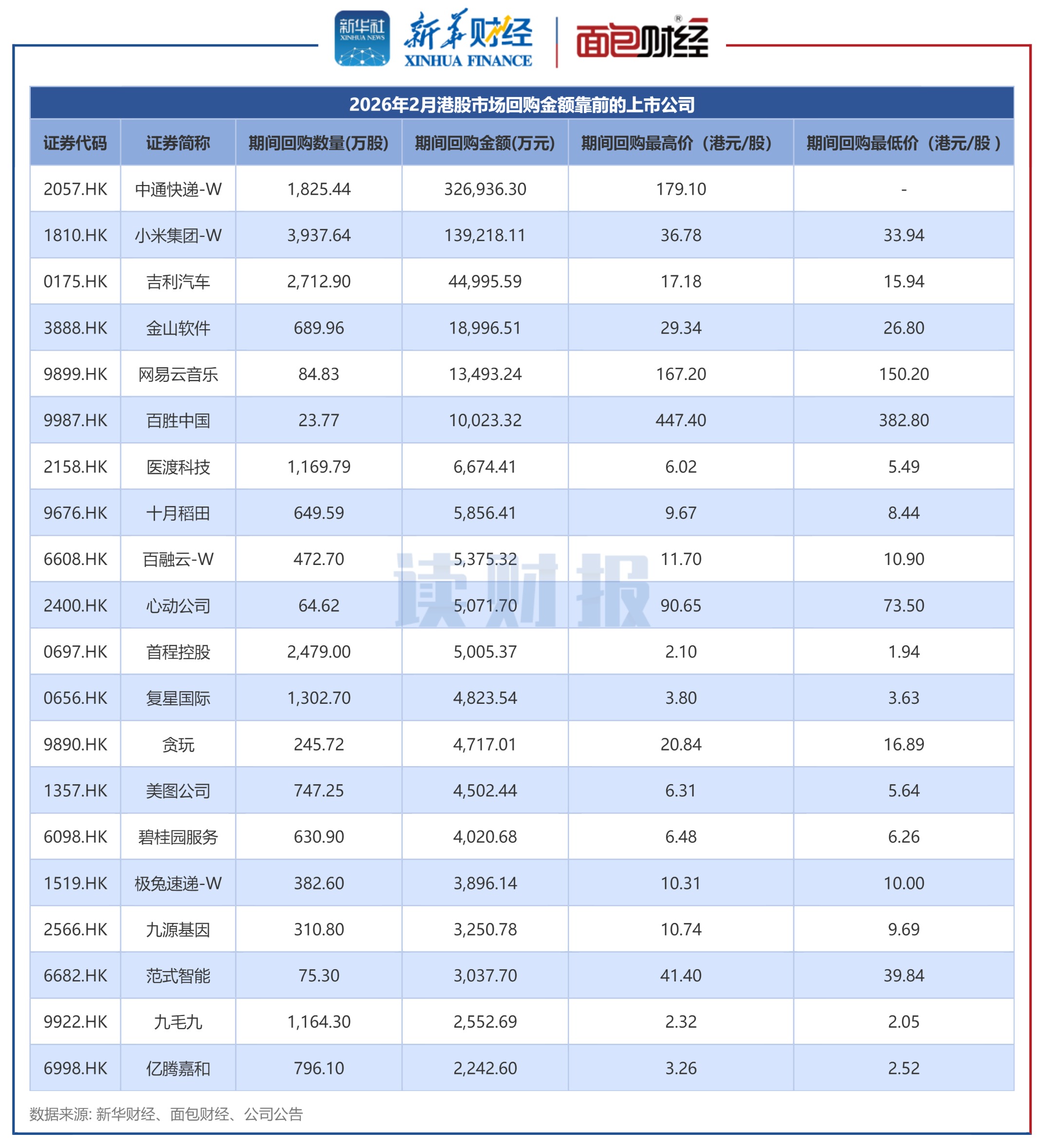 中通快遞2月回購金額居首,達到32.69億元。數據顯示,中通快遞於2月4日回購1825.44萬股,回購價格為179.1港元/股。