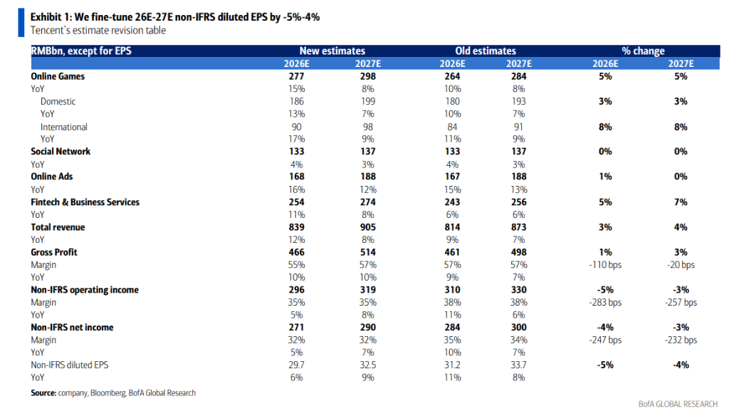 為了反映AI投資的增加,美銀美林將騰訊2026年和2027年的非IFRS淨利潤預期分別下調了4%和3%。