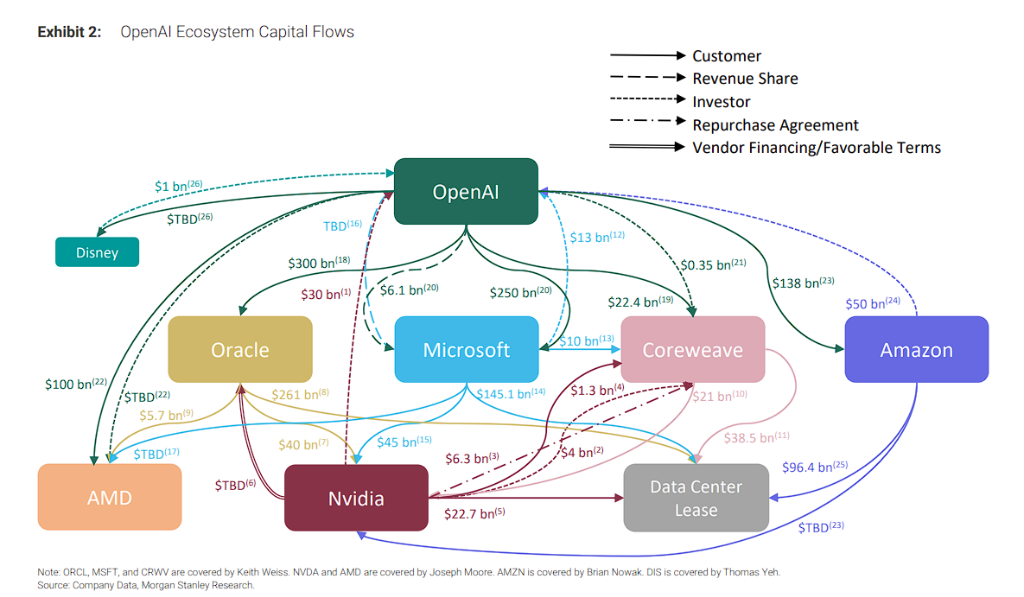 大摩認為,美國AI圈已形成「供應商與客戶互投」的資本內循環,以支撐龐大算力擴張。該模式通過表外擔保、認股權證等掩蓋了真實槓桿與系統性風險。該行以OpenAI生態為核心,揭示了英偉達、微軟、甲骨文、AMD、亞馬遜及迪士尼等巨頭間數千億美元的交叉投資、算力租賃與IP捆綁。