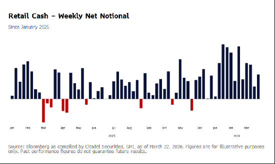 與此同時,散戶投資者在市場劇烈波動中保持了韌性。據Rubner稱,他們基本沒有出現恐慌性拋售,而是堅持逢低買入和逢高套現的模式。城堡證券的數據顯示,自伊朗衝突開始以來,散戶投資者僅有三天錄得淨賣出。
