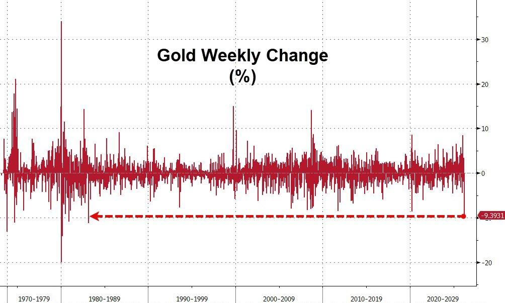 黃金的潰敗尤為觸目驚心。現貨黃金本周累計下跌逾10%,COMEX黃金期貨周跌幅超過11%,創下自1983年3月以來最大單周跌幅。