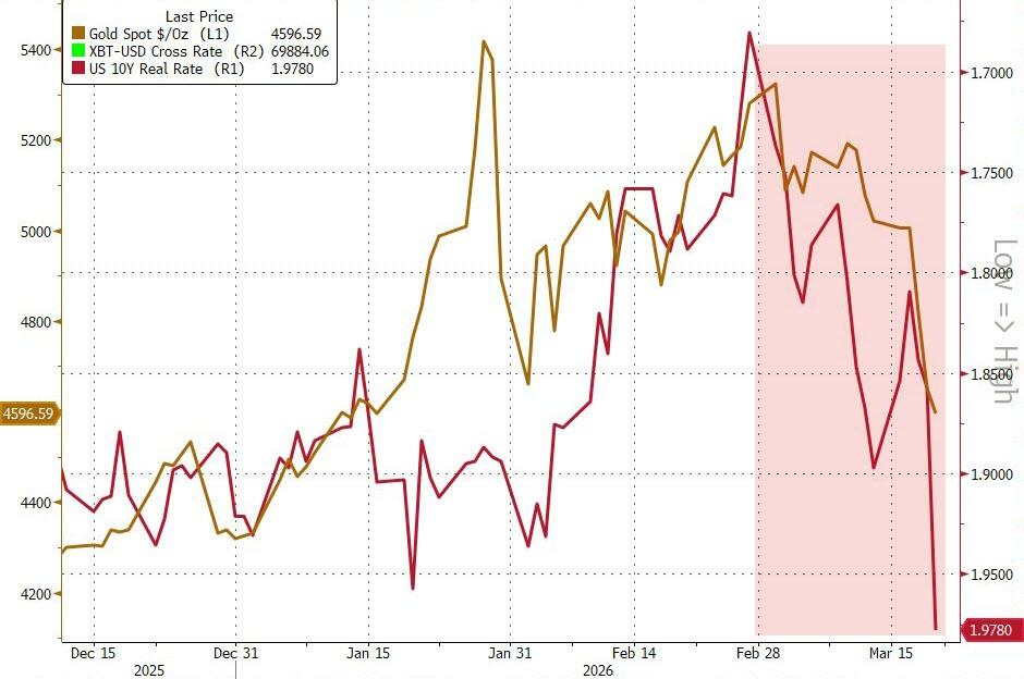 分析人士將本輪金價下跌部分歸因於美元孖展壓力顯現。跨貨幣基差掉期本周明顯擴大,暗示市場存在美元流動性緊張跡象;黃金亦重新與實際利率呈現負相關——隨着實際利率快速攀升,黃金承壓下行。